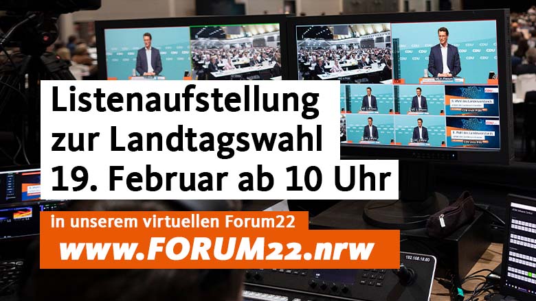 Am Samstag, 19. Februar, stellen wir in der Essener Gruga-Halle unser Team für die Landtagswahl auf. Seien Sie dabei, wenn wir unseren Landesvorsitzenden, Ministerpräsident Hendrik Wüst, als Spitzenkandidaten der CDU Nordrhein-Westfalen nominieren. Wir übertragen die Veranstaltung im #Livestream: Drüben in unserem Forum22.